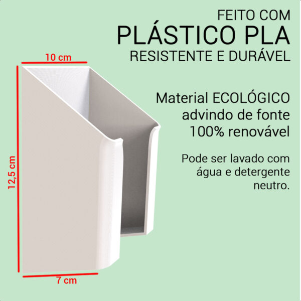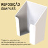 Fabricado em plástico premium estruturado, o dispenser é resistente, leve e fácil de higienizar. Pode ser lavado com esponja macia e detergente neutro ou limpo com álcool. Evite o uso de solventes ou produtos abrasivos.