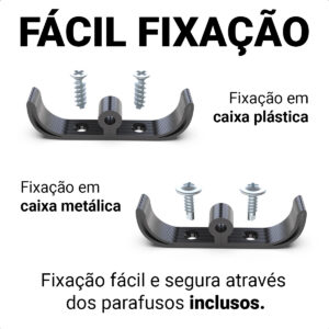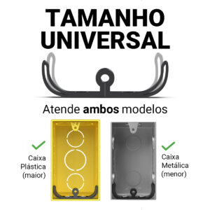 • Design Universal: Compatível com todos os tipos e tamanhos de caixas elétricas (4×2 e 4×4), sejam metálicas ou plásticas. O formato inteligente adapta-se e centraliza automaticamente para fixação precisa.