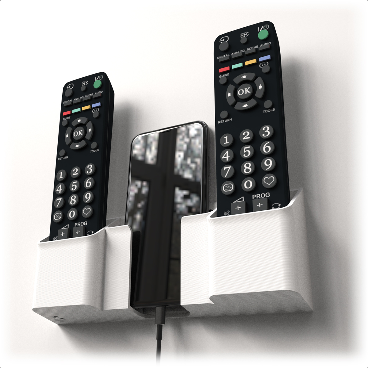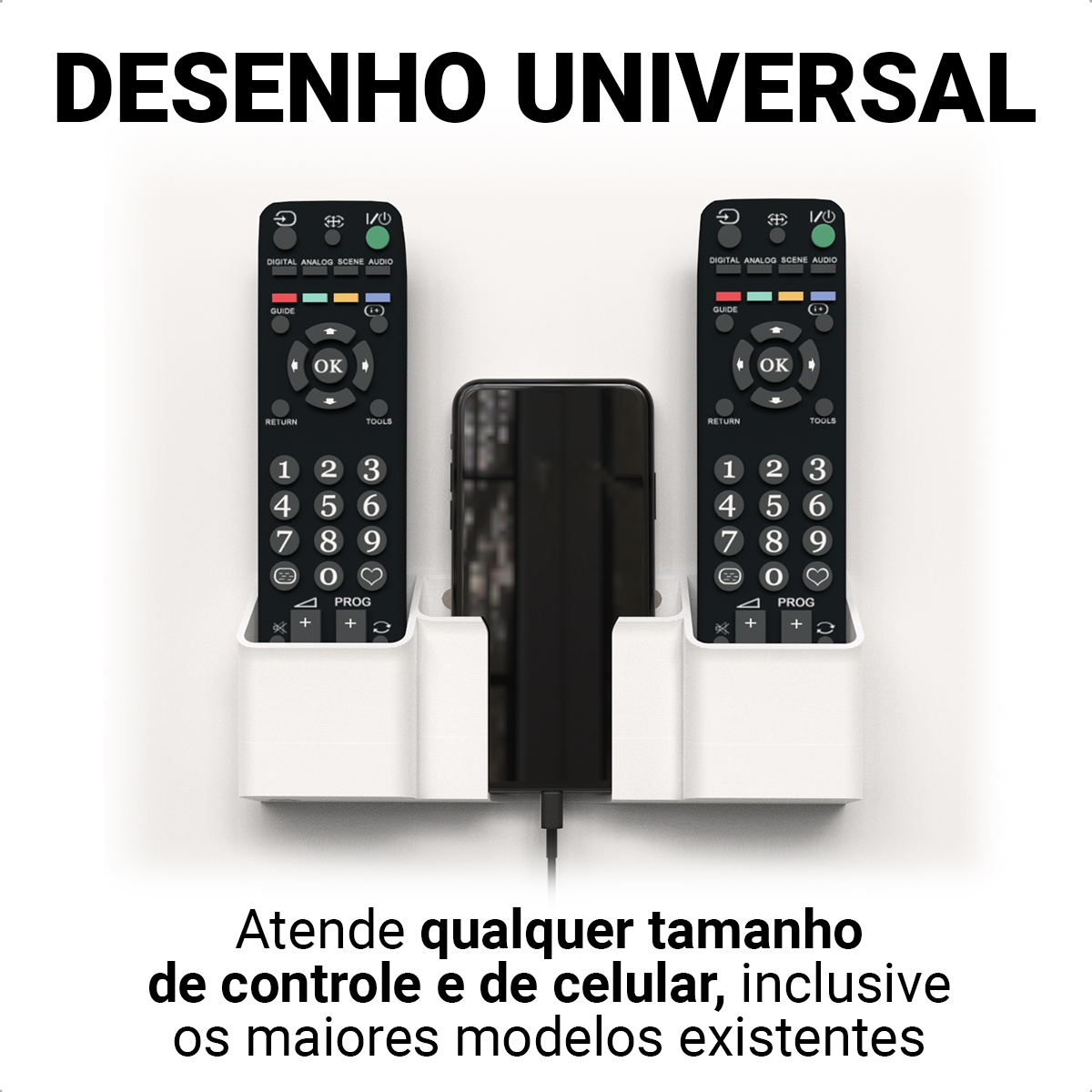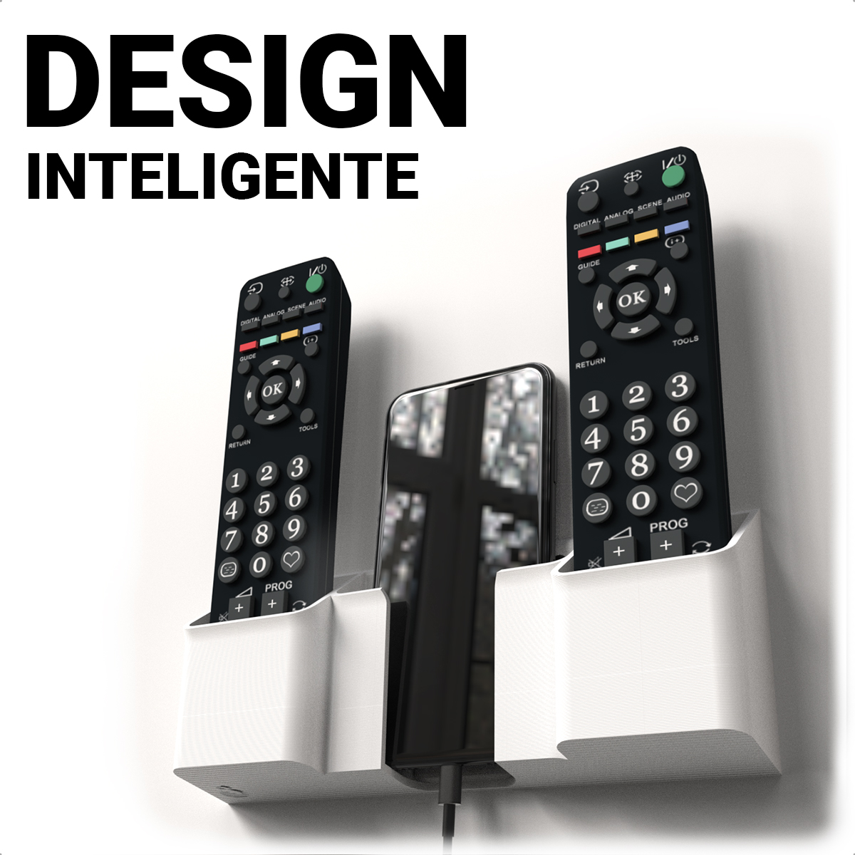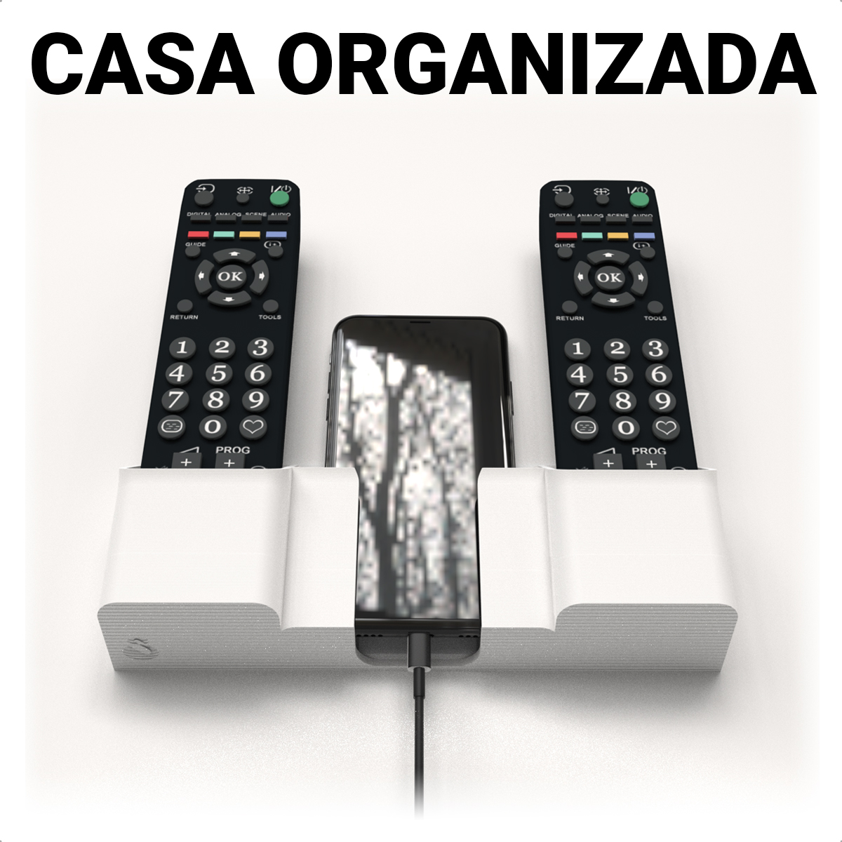 Mantenha seu celular e controles sempre organizados com um suporte de parede prático, moderno e fácil de instalar.