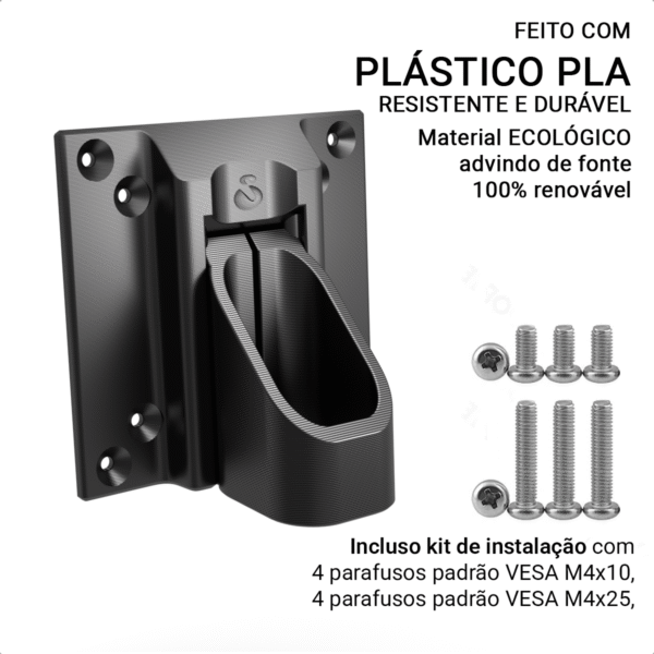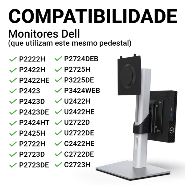 • Montagem VESA 75/100: Permite fixação atrás do monitor e na haste do pedestal, compatível com os modelos Dell P2222H e P2422H. Acompanha parafusos M4 (10 mm e 25 mm) para instalação completa.