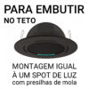 A instalação é simples e segue o mesmo princípio de um spot de iluminação embutido. O suporte conta com presilhas metálicas de mola (inclusas) que garantem fixação firme e segura, dispensando o uso de parafusos aparentes.