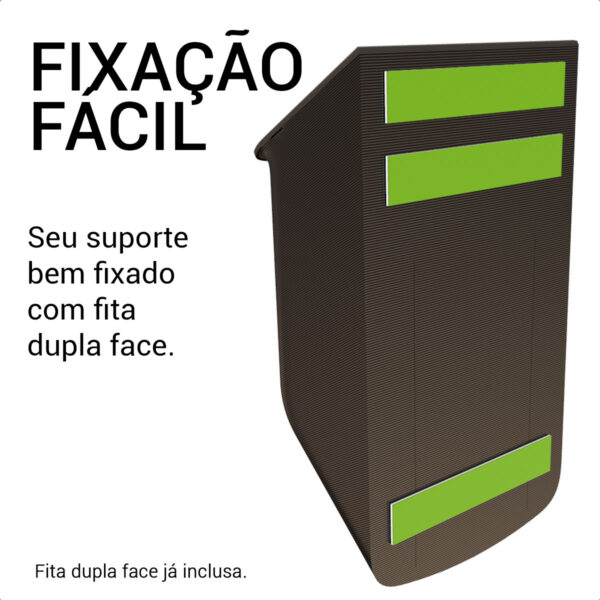 - Fixação adesiva — sem furos e sem sujeira;