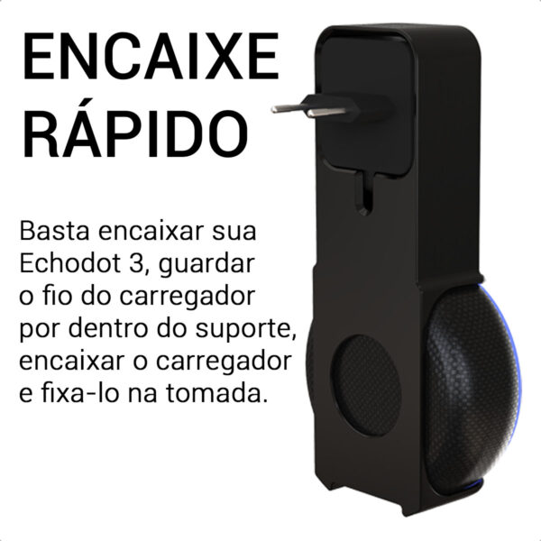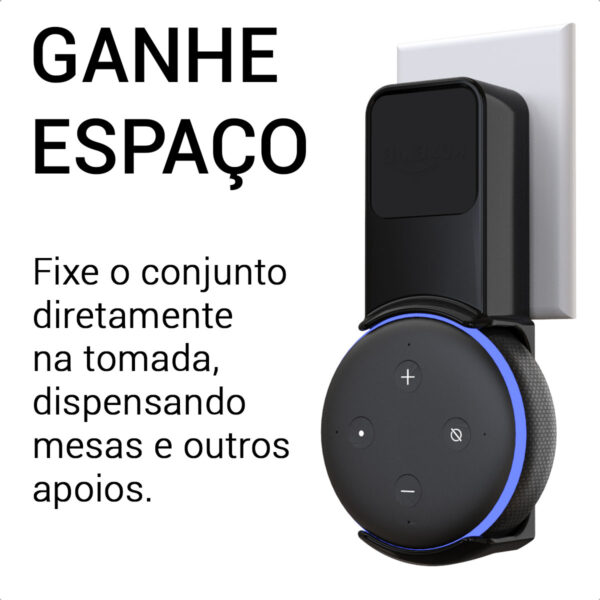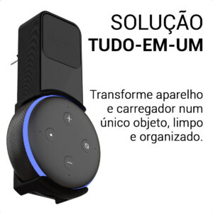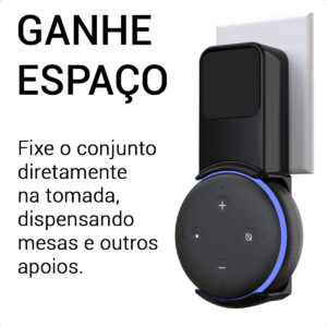 A instalação é simples e dispensa ferramentas: basta encaixar o suporte na tomada e posicionar a sua Echo Dot. Em segundos, o conjunto está fixo e pronto para uso, garantindo um visual limpo e elegante.