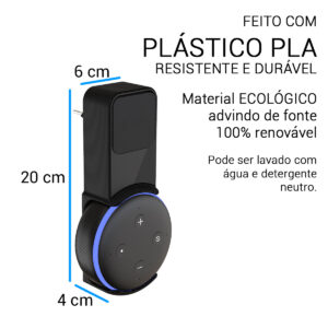 Além de economizar espaço, o suporte protege sua Alexa contra quedas e respingos, mantendo os cabos organizados e o dispositivo sempre pronto para uso. Seu formato foi projetado para não obstruir as saídas de som e preservar a qualidade do áudio.