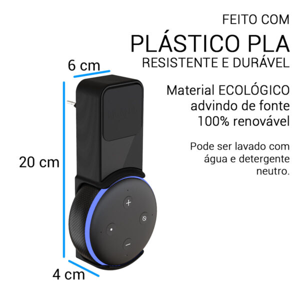 Com encaixe preciso e estrutura compacta, o suporte mantém a Echo Dot 3 firme e estável na tomada. Seu design minimalista valoriza o ambiente e garante total acessibilidade aos botões, LEDs e microfones, sem interferir na qualidade do som.