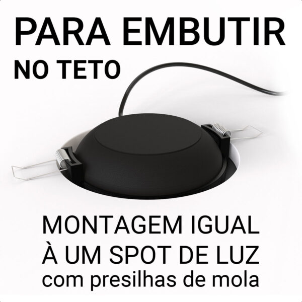 A instalação é rápida e prática, semelhante à de um spot de luz. O suporte acompanha presilhas de mola e um gabarito de corte para facilitar o encaixe perfeito no teto.