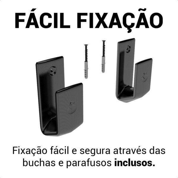 O suporte é fixado através de parafusos e buchas inclusos, garantindo total estabilidade em paredes, painéis de madeira ou alvenaria. O sistema de instalação é simples, confiável e projetado para uso prolongado com segurança.