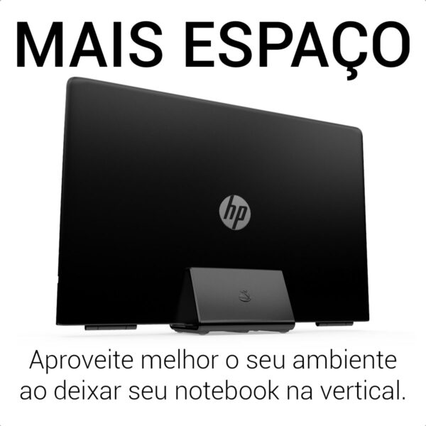 O suporte possui pezinhos de silicone antiderrapantes tanto na base quanto na área interna, evitando que o notebook escorregue ou arranhe. A estrutura é leve, firme e estável, oferecendo total segurança ao equipamento.