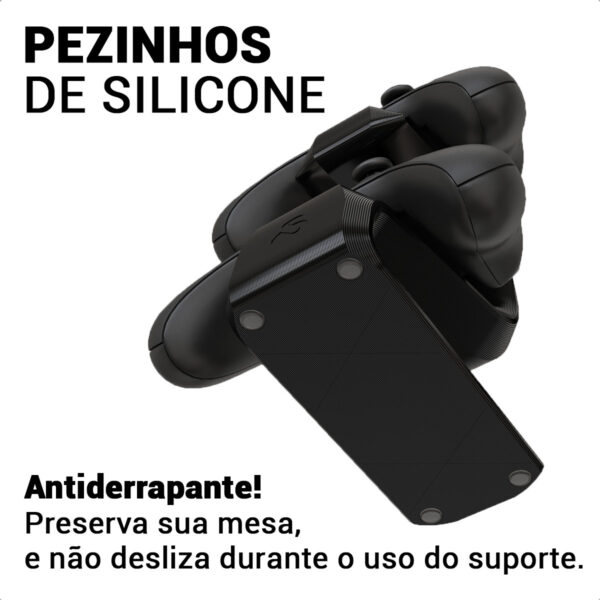 Equipado com pezinhos de silicone antiderrapantes, o suporte oferece máxima estabilidade sobre qualquer superfície, evitando deslizamentos e riscos na mesa. Ideal para uso em home office, estúdios e setups gamer.