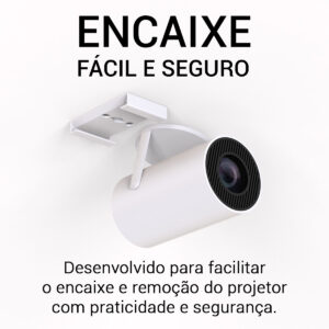 • Sistema de Encaixe Inteligente: O projetor desliza facilmente para dentro do suporte, garantindo firmeza e permitindo remoção rápida para transporte.