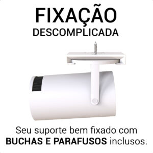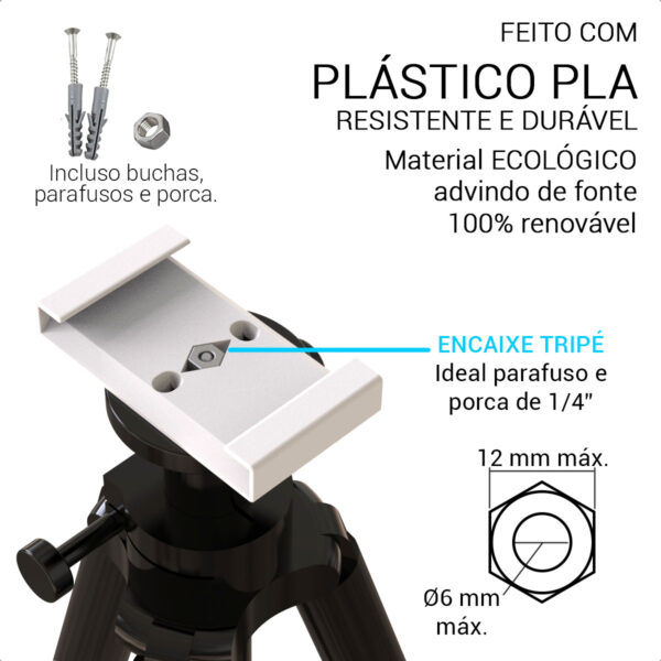 A instalação é feita em poucos minutos utilizando os 2 parafusos e 2 buchas inclusas. O suporte conta com furação compatível com tripé e já acompanha porca de 1/4” para montagem em pedestais fotográficos ou bases móveis.