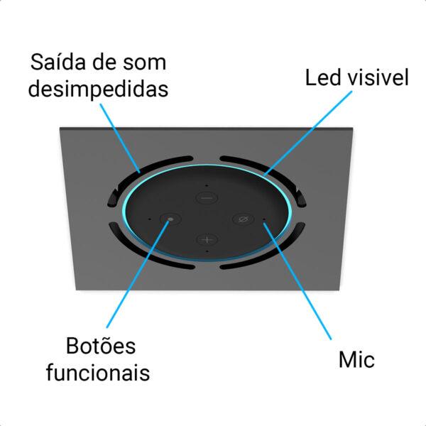 Com visual minimalista e acabamento refinado, o suporte quadrado se adapta a qualquer tipo de decoração. Ele foi projetado para não interferir na acústica nem nos microfones da Echo Dot 3, garantindo total funcionalidade do aparelho.