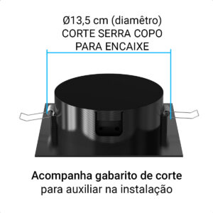A instalação é simples e segue o mesmo princípio dos spots de iluminação embutidos. O suporte conta com presilhas metálicas que garantem fixação firme e segura no teto de gesso, PVC ou drywall.