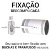 A instalação é feita em poucos minutos utilizando os 2 parafusos e 2 buchas inclusas. O suporte possui furação compatível com fixação em tripé padrão 1/4”, oferecendo múltiplas opções de montagem — no teto, na parede ou em bases móveis.