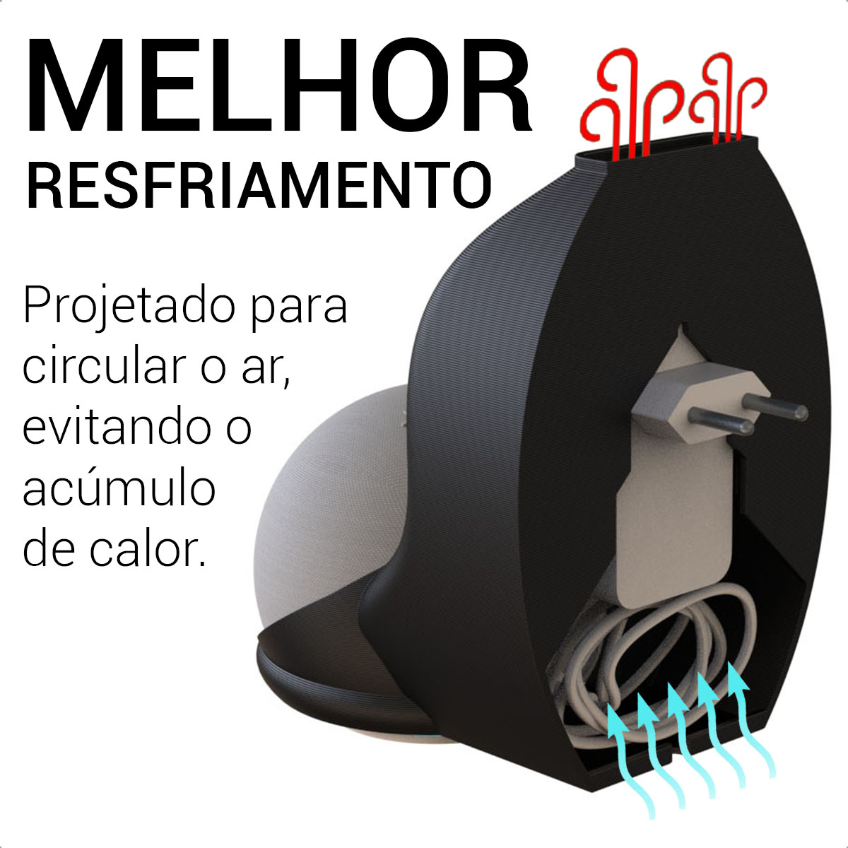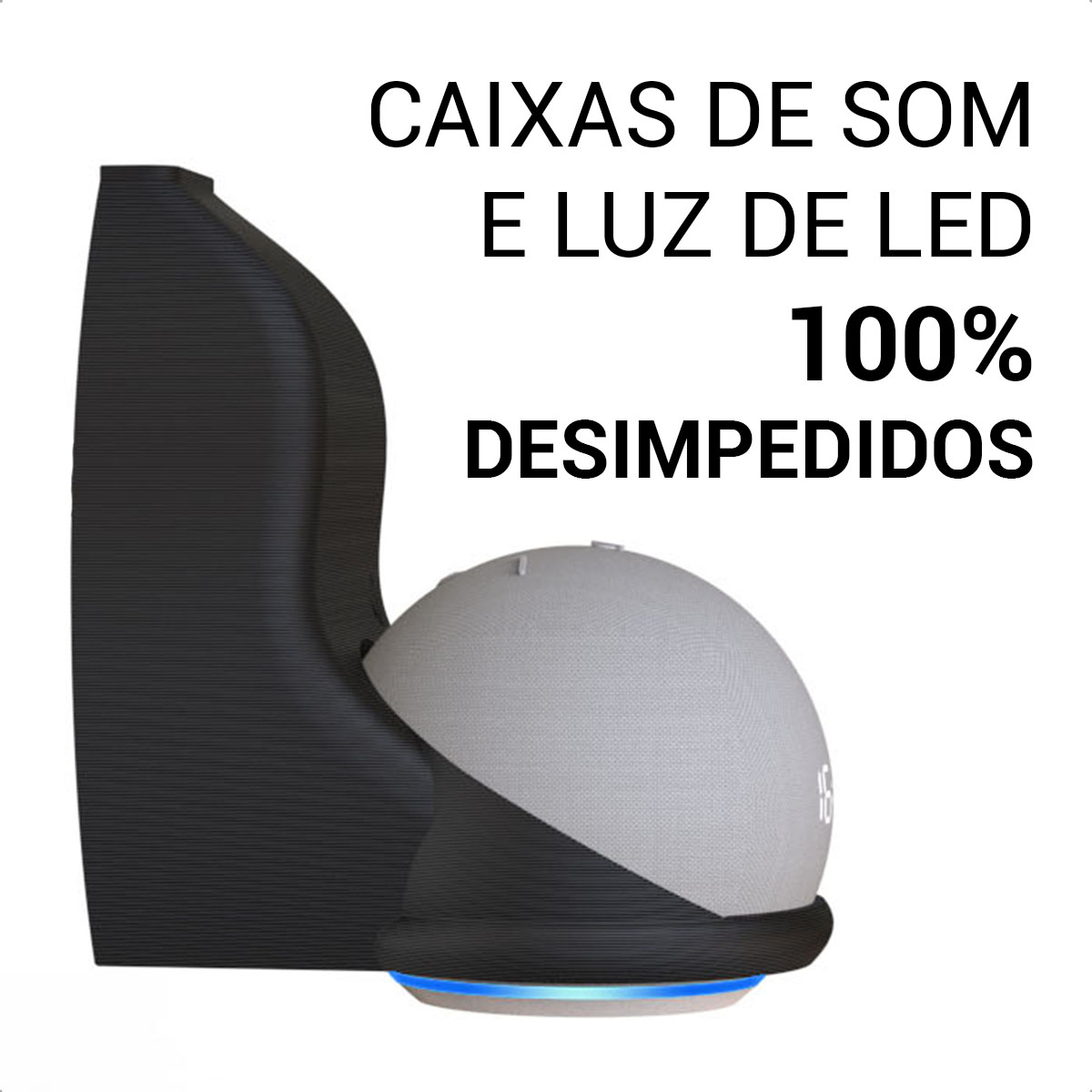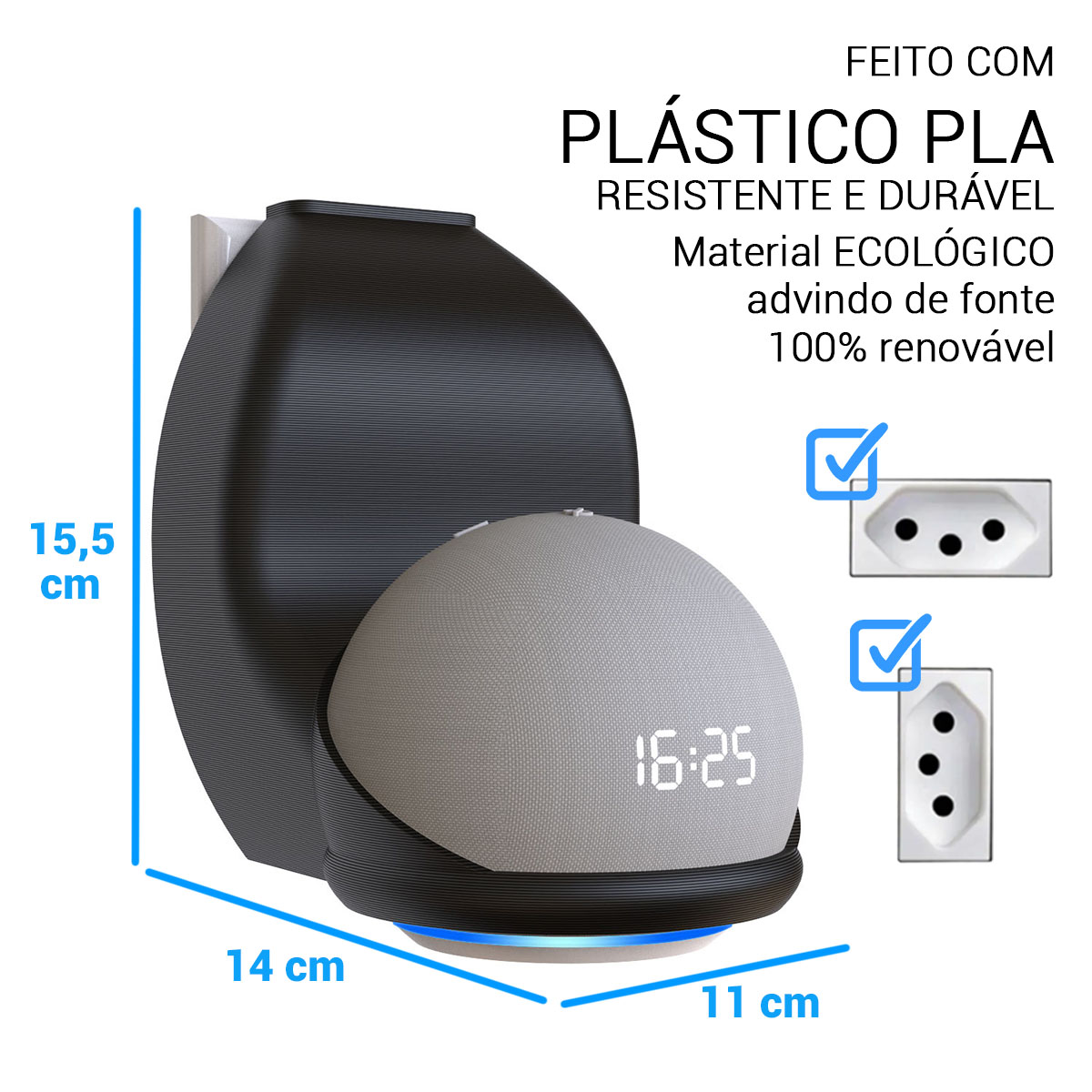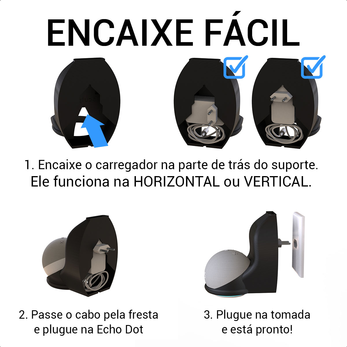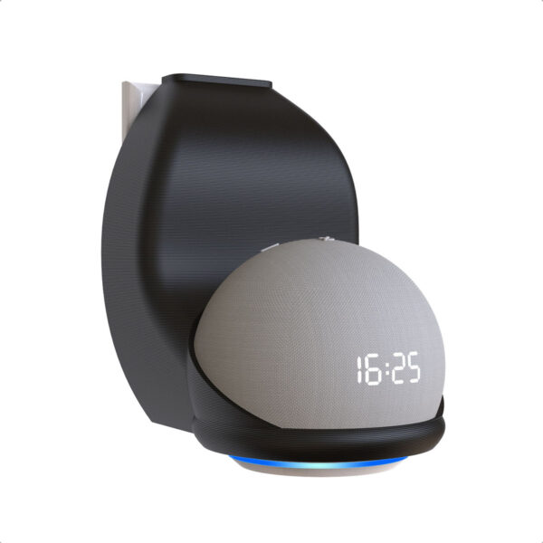 Otimize seu espaço com o suporte Sculpy “Tudo-em-Um” para Echo Dot 4 e 5 — instalação direta em tomadas verticais ou horizontais, com design inteligente e encaixe perfeito.
