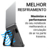 O design eleva o notebook da superfície, permitindo a circulação de ar sob o equipamento e reduzindo o aquecimento durante o uso. Essa característica prolonga a vida útil do notebook e melhora o desempenho, especialmente em longas sessões de trabalho ou uso intenso.
