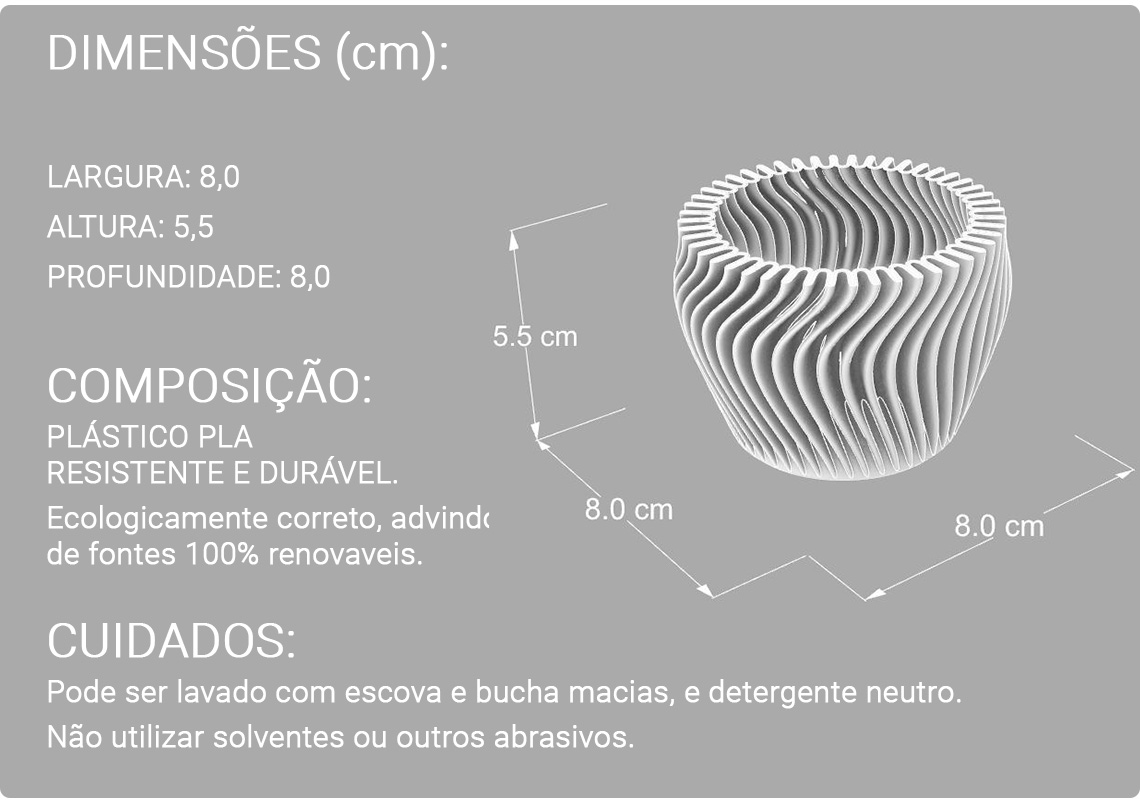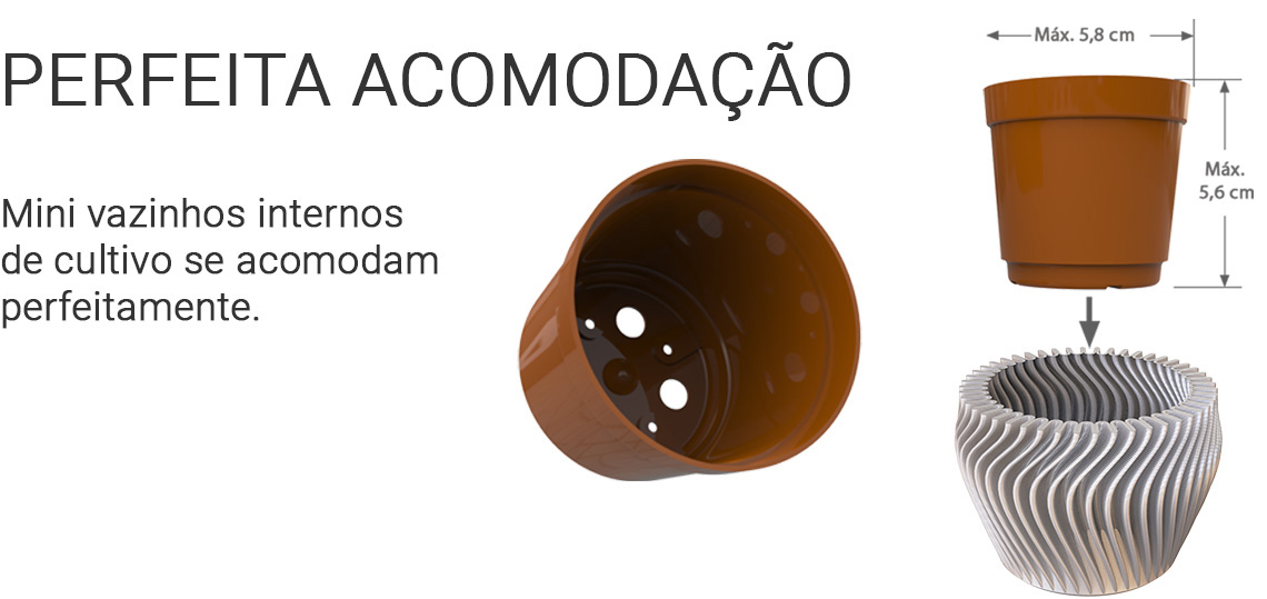 Produto com design único e exclusivo, desenvolvido para acomodar com perfeição os mini vasos internos de cultivo (aqueles vasinhos furados nas quais as plantas se encontram quando compramos elas em lojas e mercados).