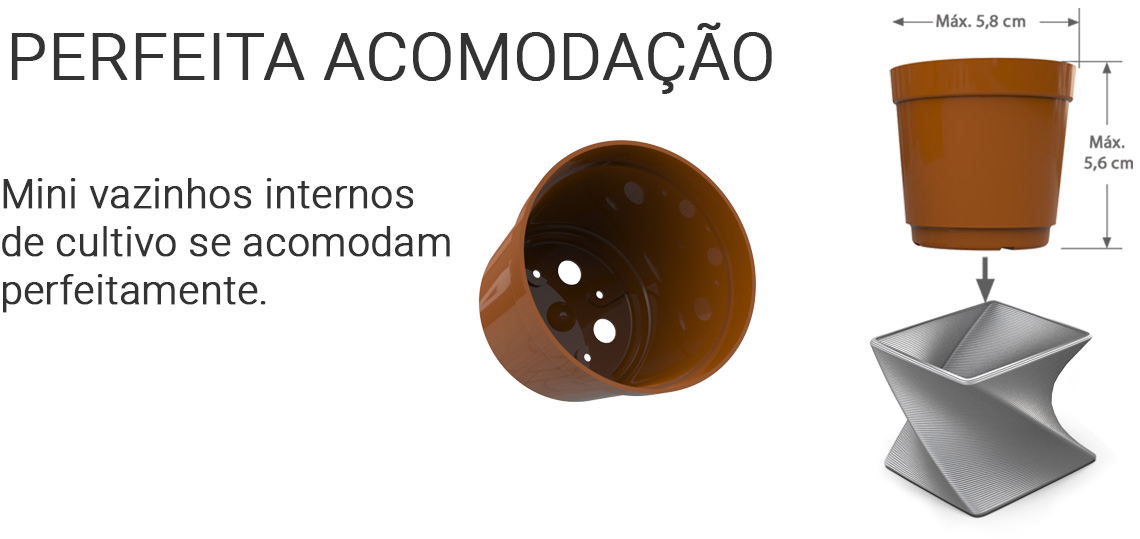 Produto com design único e exclusivo, desenvolvido para acomodar com perfeição os mini vasos internos de cultivo (aqueles vasinhos furados nas quais as plantas se encontram quando compramos elas em lojas e mercados).