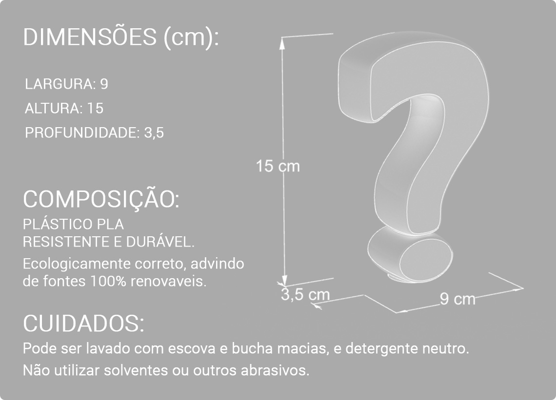 PONTO DE INTERROGAÇÃO DECORATIVO DE MESA E PRATELEIRAPRODUTO EM ESTOQUE. ENVIO IMEDIATO. Fabricado com material plástico ecologicamente correto, com alta qualidade e acabamento. - Projetado para ficar estável em pé em mesas e prateleiras. Não cai facilmente!   - Pode ser fixado em paredes e painéis, inclusive com fita com fita dupla-face (não inclusa)- Fácil limpeza! Pode ser lavado com bucha delicada, escova de cerdas macias e detergente neutro.  As medidas podem ser verificadas na desenho técnico da última imagem. (9 cm L x 15 cm A x 3,5 cm P )Decora qualquer ambiente e é perfeito para quem faz lives, podcasts, etc. Agradecemos pela compra! Sculpy - Printing Lifestyle