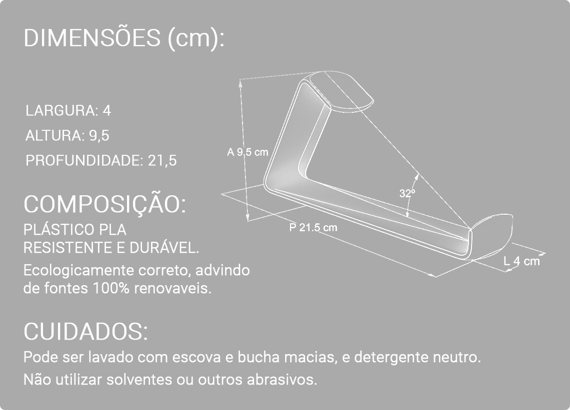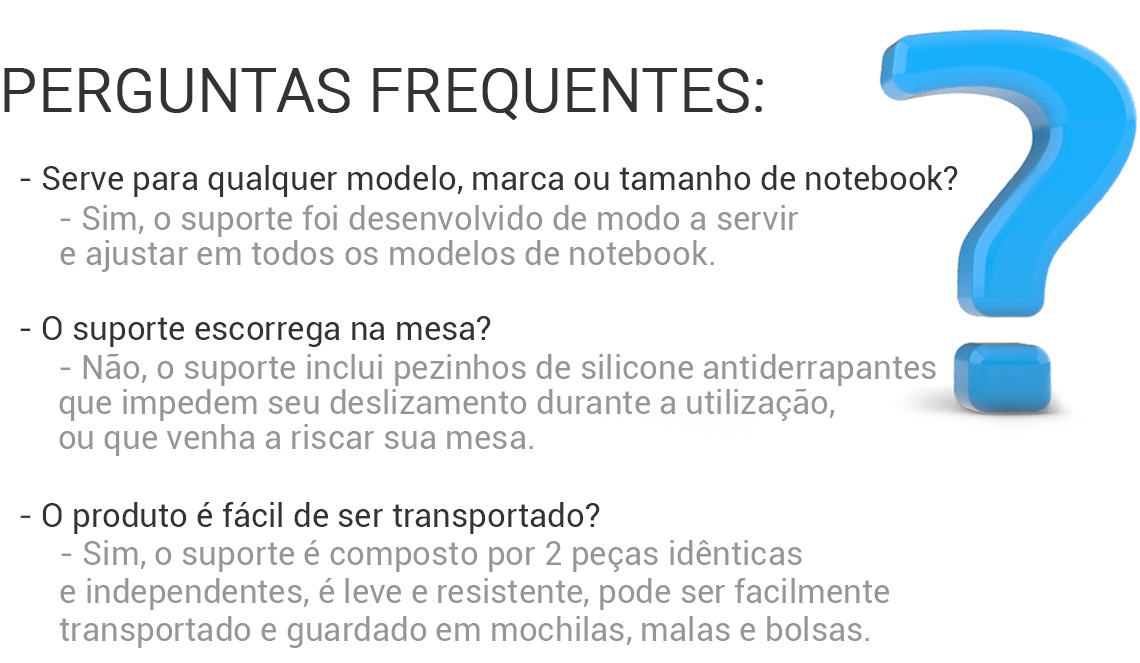 SUPORTE UNIVERSAL PARA NOTEBOOKS / LAPTOP (COMPOSTO POR DUAS PEÇAS IDENTICAS, TOTALIZANDO 2 PEÇAS) - SERVE 1 NOTEBOOKPRODUTO EM ESTOQUE, PRONTA ENTREGA - ENVIO IMEDIATO!! ERGUE e ANGULA (32 GRAUS) o NOTEBOOK elevando a tela em posição mais ergonômica, na altura mais dos olhos, o que evita dores nas costas e torna seu trabalho mais confortável e agradável, por mais tempo. EXCELENTE TAMBÉM PARA QUEM USA TELA e TECLADO EXTRA. MELHORA A VENTILAÇÃO DA PARTE TRASEIRA DO SEU NOTEBOOK, por desencosta-lo da mesa. Peça com design exclusivo e elegante, by Sculpy - Testado e Aprovado! Fabricado em plástico, resistente e durável, com garantia de fábrica. Pezinhos de silicone antiderrapantes, inclusos, diferenciam este produto por não deslizar na mesa, podendo usar o próprio teclado e mouse-pad do NOTEBOOK. Trata-se de um par de suportes, que podem ser usados na distância entre eles que melhor se adequar ao seu LAPTOP. Desenhado com profundidade para suportar mesmo os maiores modelos de NOTEBOOK. Traz funcionalidade e organização, com forma elegante, para seu escritório ou home-office, Adequado para todas as marcas e tamanhos, deixando desimpedida qualquer entrada/saída de cabos e etc. OBSERVAÇÃO: Para realizar a compra de diferentes cores, utilizando o mesmo frete, primeiro selecione a primeira cor e quantidade desejada, adicione ao carrinho, volte para o anúncio, e em seguida selecione a próxima cor desejada e quantidade, e adicione ao carrinho, e assim por diante. Quando tiver adicionado tudo que deseja ao carrinho, selecione "Comprar do carrinho", finalizando a compra toda em conjunto, pagando um único frete para o conjunto de produtos do mesmo vendedor. Você também pode adicionar outros itens nossos, nesse mesmo sistema, reduzindo o custo de frete.- Pode ser higienizado com álcool 70%, ou lavado com esponja/escova e detergente; Garantimos total satisfação com nossos produtos, ou seu dinheiro de volta.Sculpy - Printing Lifestyle